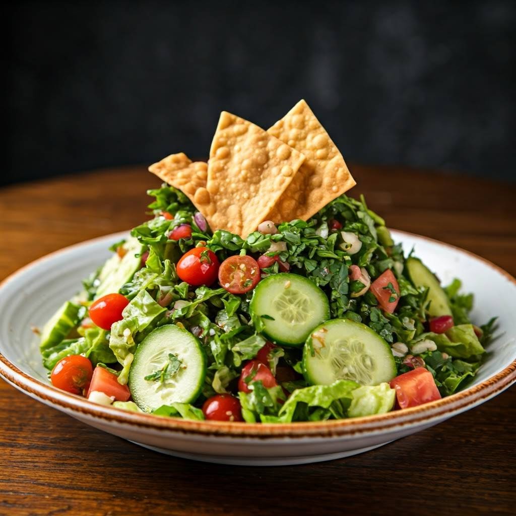 Fattoush to kolorowa, aromatyczna sałatka pełna świeżych warzyw, z dodatkiem prażonego chleba pita i kwaskowego sumaku. Idealna jako lekki posiłek albo dodatek do mięsa z grilla czy falafeli.