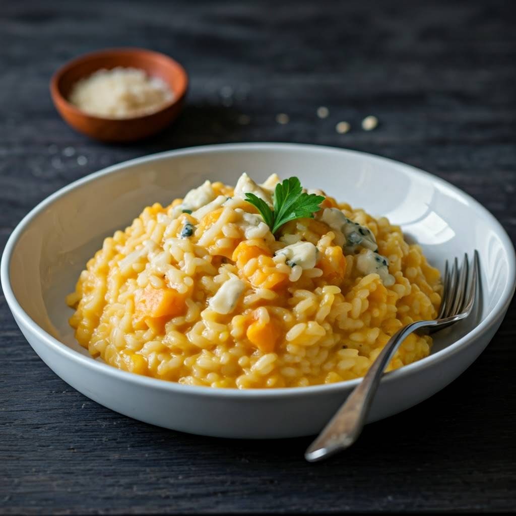 To danie to prawdziwa bomba smaku – aksamitne risotto z dynią, aromatycznym białym winem i wyrazistą gorgonzolą. Idealne na jesienny obiad lub elegancką kolację!
