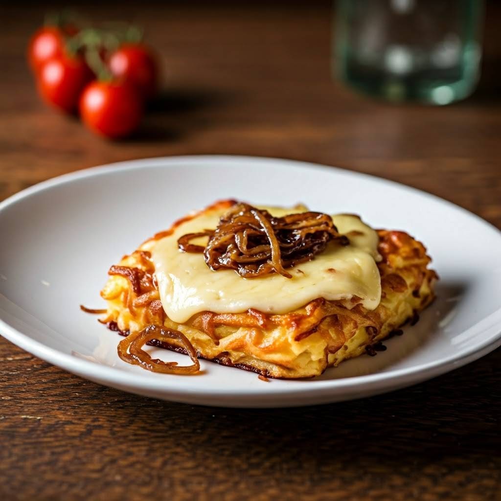 Rösti to klasyczne szwajcarskie danie z ziemniaków – coś pomiędzy plackiem ziemniaczanym a chrupiącą zapiekanką. W tej wersji wzbogacimy je o ser typu Gruyère i słodką karmelizowaną cebulkę – połączenie, które rozpływa się w ustach.